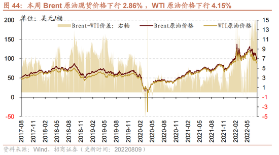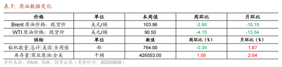 Brent国际原油价格下行。截至2022年8月9日,Brent原油现货价格周环比下行2.86%至103.96美元/桶,WTI原油价格下行4.15%至90.50美元/桶。在供给方面,截至2022年8月5日,美国钻机数量当周值为764部,较上周减少0.39%;截至2022年7月29日,全美商业原油库存量周环比上行1.06%至4.27亿桶。