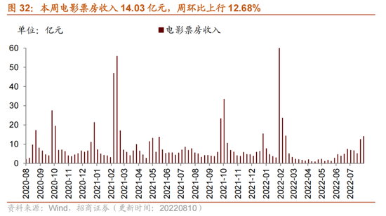 本周电影票房收入、观影人数、电影上映场次上行。截至8月7日,本周电影票房收入14.03亿元,周环比上行12.68%;观影人数3429万人,周环比上行12.50%;电影上映251.32万场,周环比上行5.94%。