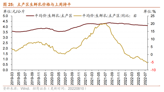 主产区生鲜乳价格与上周持平。截至8月9日,主产区生鲜乳价格报4.11元/公斤,与上周持平,较去年同期下降5.95%。截至7月21日,乳制品当月产量275.10万吨,月环比下行0.29%,较去年同期上行2.31%。