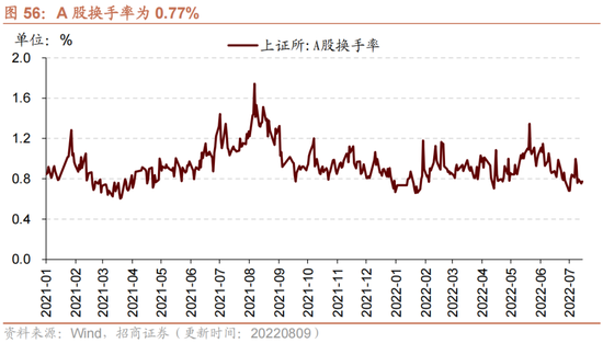 A股换手率、日成交额下行。截至8月9日,上证A股换手率为0.77%,较上周下行0.22个百分点;沪深两市日总成交额下行,两市日成交总额为8840.80亿元人民币,较上周下行20.65%。