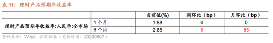 1个月理财产品收益率较上周持平,6个月理财产品收益率较上周上行。截至8月7日,1个月理财产品预期收益率较上周持平为1.88%。6个月理财产品预期收益率为2.85%,较上周上行5bp。
