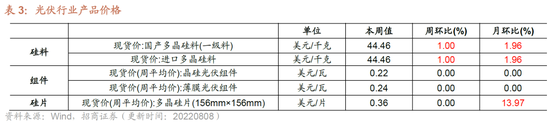 本周光伏产业链中硅料价格上行,组件、硅片价格维持不变。在硅料方面,截至8月8日,国产多晶硅料价格为44.46美元/千克,较上周上行1.00%;进口多晶硅料价格为44.46美元/千克,较上周上行1.00%。在组件方面,截止8月3日,晶硅光伏组件的价格为0.22美元/瓦,与上周持平;薄膜光伏组件的价格为0.24美元/瓦,与上周持平。在硅片方面,截止8月3日,多晶硅片价格为0.36元/片,与上周持平。