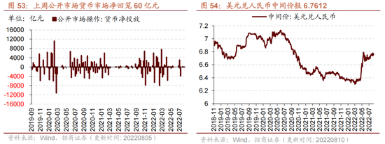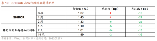 本周货币市场净回笼60亿元,隔夜SHIBOR利率较上周上行。截至8月10日,隔夜SHIBOR较上周上行4bp至1.07%,1周SHIBOR较上周上行4bps至1.43%,2周SHIBOR较上周下行6bp至1.33%。截至8月9日,1天银行间同业拆借利率较上周下行5bp至1.10%,7天银行间同业拆借利率较上周下行14bp至1.61%,14天银行间同业拆借利率下行2bs至1.49%。在货币市场方面,截至8月5日,上周货币市场投放100亿元,货币市场回笼160亿元,货币市场净回笼60亿元。在汇率方面,截至8月10日,美元兑人民币中间价报6.7612,与较上周下行。