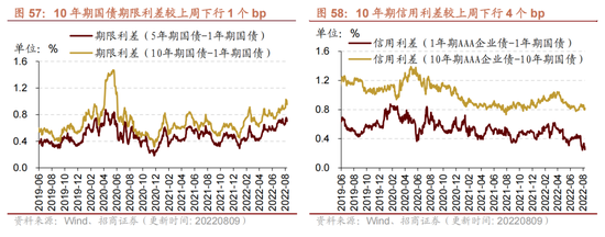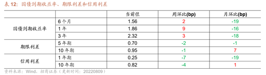 在债券收益率方面,6个月/1年/3年国债到期收益率较上周上行。截至8月9日,6个月国债到期收益率较上周上行2bp至1.56%;1年国债到期收益率较上周上行9bp至1.86%,3年期国债到期收益率较上周上行3bp为2.32%。5年期债券期限利差较上周下行2bp至0.70%;10年期债券期限利差较上周下行1bp至0.95%;1年期AAA债券信用利差较上周下行7bp至0.25;10年期AAA级债券信用利差较上周下行4bp至0.82%。