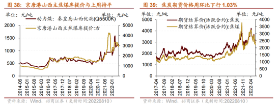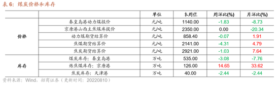 价格方面,秦皇岛港动力煤报价下行、京唐港山西主焦煤库提价与上周持平;动力煤、焦炭、焦煤期货结算价下行。截至8月9日,秦皇岛港动力煤报价1140.00 元/吨,周环比下行1.83%;截至8月9日,京唐港山西主焦煤库提价2350.00元/吨,与上周持平。截至8月10日,焦炭期货结算价收于2921.00元/吨,周环比下行1.03%;焦煤期货结算价收于2141.00元/吨,周环比下行4.31%;动力煤期货结算价858.40元/吨,周环比下行0.07%。截至8月4日,沿海主要电厂日耗229.0 万吨,旬环比上行3.76%。