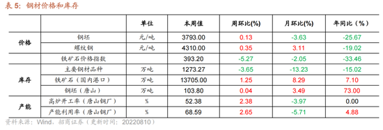 本周铁矿石价格下行、钢坯、螺纹钢价格上行;主要钢材品种库存下行,国内港口铁矿石库存上行,唐山钢坯库存上行;唐山钢厂高炉开工率上行,唐山钢厂产能利用率上行。产量方面,截至7月31日,重点企业粗钢日均产量为189.02 万吨/天,同比下行7.25%,全国粗钢预估日均产量为267.03 万吨/天,同比下行9.91%,旬环比下行5.88%。价格方面,截至8月9日,螺纹钢价格为4310.00 元/吨,周环比上行0.35%;截至8月9日,钢坯价格3793.00 元/吨,周环比上行0.13%;截至8月9日,铁矿石价格指数为393.20 ,周环比下行5.27%。库存方面,截至8月4日,国内港口铁矿石库存量为13705.00万吨,周环比上行1.25%;截至8月4日,唐山钢坯库存量为103.80万吨,周环比上行0.04%;截至8月5日,主要钢材品种库存周环比下行3.65%至1273.27万吨。产能方面,截止8月5日,唐山钢厂高炉开工率52.38%,较上周上行2.38个百分点;唐山钢厂产能利用率68.59 %,较上周上行2.65个百分点。