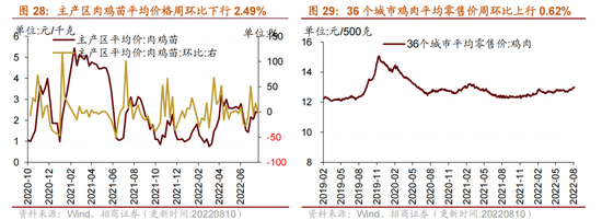 在肉鸡养殖方面,肉鸡苗价格下行,鸡肉价格上行。截至8月5日,主产区肉鸡苗平均价格为2.35 元/羽,周环比下行2.49%;截至8月9日,36个城市平均鸡肉零售价格为13.04元/500克,周环比上行0.62%。
