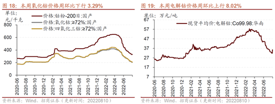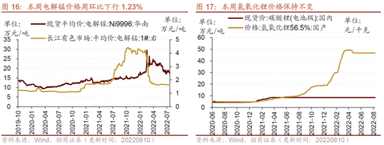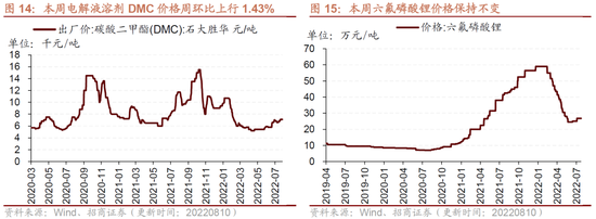 本周DMC、电解钴价格上行,正极材料、部分钴产品价格下行,六氟磷酸锂、锂材料价格保持不变。在电解液方面,截至8月10日,电解液溶剂DMC价格周环比上行1.43%至7100.0元/吨;六氟磷酸锂价格维持在26.75万元/吨。在正极材料方面,截至8月10日,电解镍Ni9996现货平均价周环比上行2.56%至177100元/吨;电解锰市场平均价格周环比下行1.23%至16000元/吨。在锂原材料方面,截至8月10日,氢氧化锂价格维持在467500元/吨;电解液锰酸锂价格维持在5万元/吨;电解液磷酸铁锂价格维持在6.25万元/吨;三元材料价格维持在326.5元/千克;钴产品中,截至8月10日,钴粉价格周环比下行2.07%至330.5元/千克;氧化钴价格周环比下降3.29%至205.5元/千克;四氧化三钴价格周环比下行3.22%至210.5元/千克;电解钴价格周环比上行8.02%至350000元/吨。