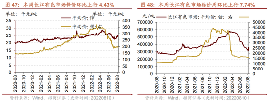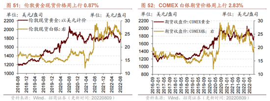 本周黄金现货价格上涨、白银现货价格上涨。截至8月9日,伦敦黄金现货价格为1795.25美元/盎司,周环比上行0.87%;伦敦白银现货价格收于20.60美元/盎司,较上周上行1.30%;COMEX黄金期货收盘价报1810.50美元/盎司,较上周上行1.93%;COMEX白银期货收盘价上行2.83%至20.50美元/盎司