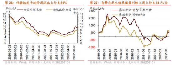 本周仔猪、生猪、猪肉价格上行。截至8月5日,仔猪平均价24.11 元/千克,周环比上行5.51%;生猪平均价10.70 元/千克,周环比上行1.17%;猪肉平均价29.16 元/千克,周环比上行0.34%。在生猪养殖利润方面,本周自繁自养生猪养殖盈利扩大,外购仔猪养殖盈利扩大。截至8月5日,自繁自养生猪养殖利润为484.04 元/头,较上周上行4.74 元/头;外购仔猪养殖利润为691.83 元/头,较上周上行2.27 元/头。
