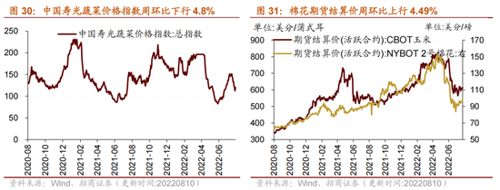 蔬菜价格指数周环比下行,棉花期货结算价上行,玉米期货结算价上行。截至8月9日,中国寿光蔬菜价格指数为119.85,周环比下行4.80%;截至8月10日,棉花期货结算价格为99.07 美分/磅,周环比上行4.49%;玉米期货结算价格为614.00 美分/蒲式耳,周环比上行3.32%。
