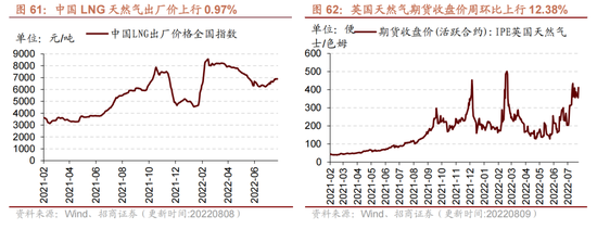 我国天然气出厂价上行,英国天然气期货结算价上行。截至8月9日,我国天然气出厂价报6887.00元/吨,较上周上行0.97%;截止8月9日,英国天然气期货结算价收于406.24便士/色姆,较上周上行12.38%。