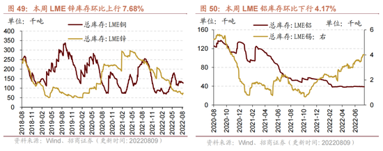 库存方面,锡、锌库存上涨,其余库存下降。截至8月9日,LME锡库存周环比上行0.13%至3990.0吨;LME铅库存较上周下行0.19%至38800.0吨;LME铜库存较上周下行3.05%至126975.0吨;LME铝库存较上周下行4.17%至284275.0吨;LME锌库存本周上行7.68%至73275.0吨;LME镍库存56382.0吨,较上周下行2.69%。