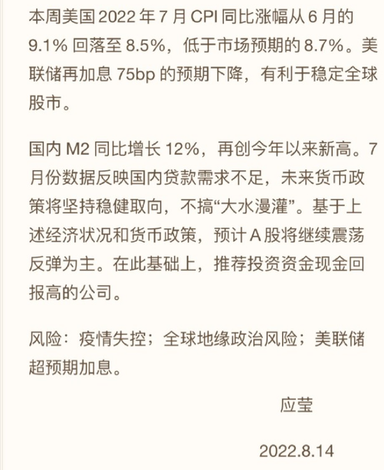 降低预期,聚焦龙头。当前市场核心矛盾依然是通胀与经济的拉锯战,虽然7月CPI上行幅度不及预期,但是趋势并未发生变化,随着本周金融数据的公布,下半年经济修复仍有颠簸。另外一方面,随着海外通胀回落,美国中期选举临近,美对华贸易政策仍有反复,对于市场情绪仍然会有所扰动。而随着M2-社融剪刀差达到高位,宽信用政策逐步推进,引导金融市场流动性逐步转向实体,与宏观经济强相关行业的预期正在发生变化。短期关注受益于国产替代方向的电子和计算机等,以及宽信用抓手的地产链和金融及消费龙头。从中期来看,通胀依然是全年最重要的投资主线,持续关注受益于通胀上行的农业,业绩稳健的食品饮料,家电和医药等消费行业龙头,以及虚拟现实,游戏等泛消费概念。