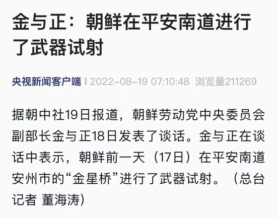 央视新闻援引朝中社19日报道,朝鲜劳动党中央委员会副部长金与正18日发表了谈话。金与正在谈话中表示,朝鲜前一天(17日)在平安南道安州市的“金星桥”进行了武器试射。