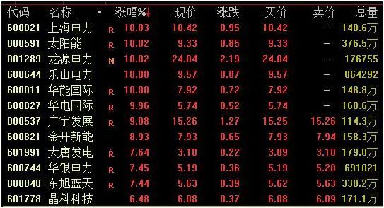 电力板块午后强势拉升,截至收盘,上海电力、太阳能、龙源电力、乐山电力、华能国际、华电国际等涨停,广宇发展、金开新能涨约9%。煤炭板块亦走强,电投能源涨停,盘江股份、兖矿能源、辽宁能源、中煤能源等涨超4%。