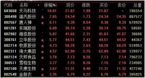 农业板块盘中发力走高,猪肉、鸡肉股表现亮眼。截至收盘,天马科技涨停,温氏股份大涨近8%,立华股份、唐人神、东瑞股份涨超6%,牧原股份、海大集团涨逾4%。