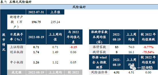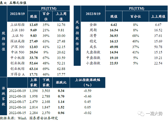 ?高度不高但时间很长,后市以横盘震荡为主。地产风险事件的出现叠加全国疫情的反复,投资者对经济预期上修与风险偏好回升的过程已暂时中断,7月至今全A盈利增速下修1.2%,卖方分析师盈利预测的分歧水平从前期的持续收敛转向持续抬升,表明对经济增长和企业盈利整体改善的看法出现更高的不确定性。我们在7月中旬的报告提出由于投资者预期的修正,后续上证指数以横盘震荡为主,横盘震荡的区间为3100-3400,时间至少持续至三季度末或四季度中旬。尽管2022年下半年宏观政策还会相对积极,但投资者当前不论是对于货币、财政、地产相关的经济政策基本预期比较充分。因此,预期内宏观政策的变化不会对当前的股票市场造成明显的影响。由于当下偏低的利率水平所对应的股票贴现率的降低,股票市场结构性的机会仍然丰富,轻指数,重结构。