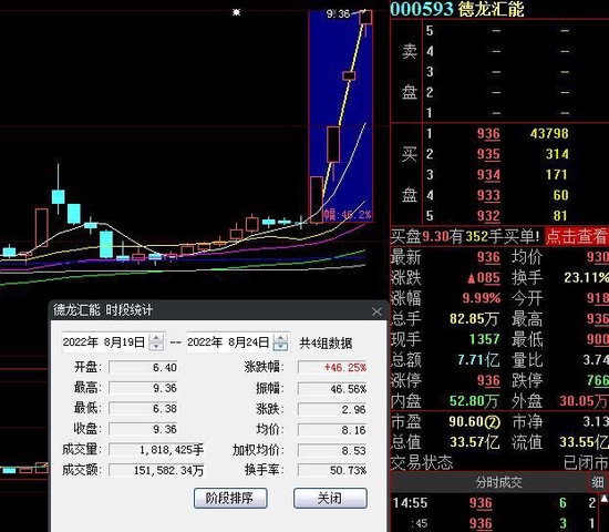 8月24日,热门股德龙汇能再度涨停,截至收盘,报9.36元,连续4个交易日涨停,期间累计涨幅达46.25%。