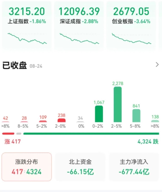 8月24日,A股三大指数集体大跌,截至收盘,上证指数跌1.86%报3215.2点,深证成指跌2.88%报12096.39点,创业板指跌3.64%报2679.05点,两市合计成交11260.3亿元,连续第7个交易日突破万亿元;北向资金净卖出66.15亿元。总体来看,A股个股跌多涨少,上涨个股为417只,下跌个股4324只。