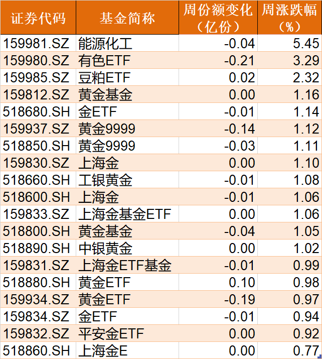 商品ETF本周集体上涨,其中能源化工、有色ETF和豆粕ETF分别上涨了5.45%、3.29%和2.32%,黄金相关ETF上涨约1%。