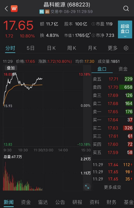 前段时间,受“通威低价中标”一事影响,光伏组件方向的几只个股股价大幅波动。今日上午,光伏组件方向的晶澳科技、晶科能源、天合光能等集体反攻。其中,晶科能源上涨10.8%,最新市值为1765亿元。