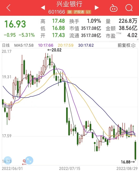 兴业银行第二季度净利润变动金额最大,净减少102.69亿元。今日该股出现罕见大跌,收盘跌幅达5.31%,最新收盘价创今年新低,A股市值回落至3517亿元。