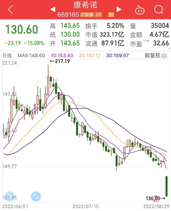 据了解,科创板公司康希诺是一家致力于研发、生产和销售符合中国及国际标准的创新型疫苗企业。康希诺于2020年8月13日上市,迄今上市满两年;在2021年6月份,公司股价创历史高点797.2元/股(前复权)。最新收盘价与历史高点相比,股价回撤幅度83.6%。