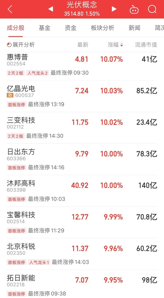 受此消息影响,宝馨科技、北京科锐、拓日新能、亿晶光电(维权)、沐邦高科等调整过的光伏概念股今日涨停。