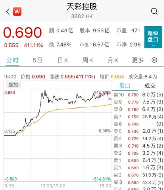 截至收盘,天彩控股收涨411.11%,报0.69港元,最新市值为6.57亿港元。