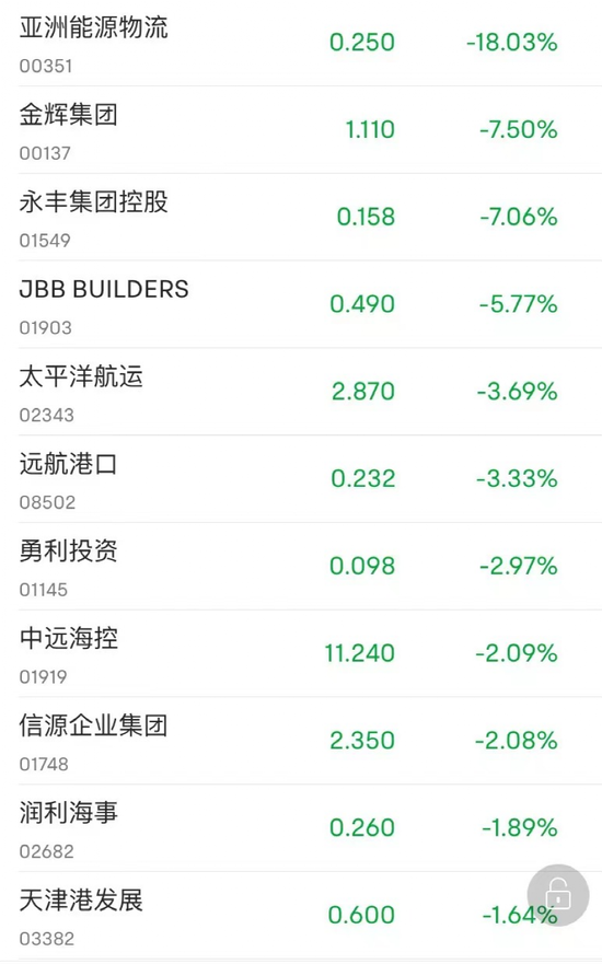 今日海运股集体下挫,跌幅居前。亚洲能源物流跌超18%,金辉集团、永丰集团跌超7%,太平洋航运、远航港口跌超3%,巨头中远海控跌超2%。