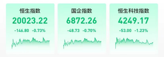 截至收盘,恒生指数收跌0.73%,报20023.22点,险守20000点;恒生科技指数跌1.23%,报4249.17点;恒生国企指数跌0.7%报6872.26点。大市成交额不足千亿港元,南向资金仍逆势净买入17.6亿港元。
