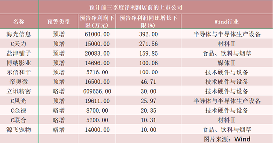 净利润增幅方面,海光信息、盐津铺子、博纳影业等5家上市公司预计2022年前三季度实现归属于上市公司股东的净利润同比增幅下限超过100%。不少上市公司预计第三季度净利润同比大幅增长,助力前三季度净利润增长。