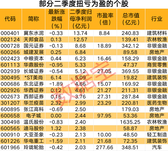 从实现归母净利润总和来看,冀东水泥、天邦食品、国元证券盈利居前。冀东水泥中报显示,公司二季度实现归母净利润13.74亿元,同比增长7.41%,二季度公司业绩快速恢复,创近三年来最好水平。公司表示,截至本报告期末,公司年熟料产能达到1.10亿吨,水泥产能达到1.76亿吨,水泥产能位列国内水泥制造企业第三名。