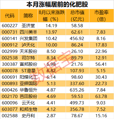 证券时报·数据宝统计,A股中主营为化肥或相关原材料的上市公司共有28家,本月以来平均上涨3.04%,圣济堂、四川美丰、兴发集团、泸天化涨幅在10%以上。受前期价格上涨影响,化肥概念股今年以来以上涨为主,6股年内高点较最低价实现翻倍,包括ST澄星(维权)、云天化、亚钾国际等。