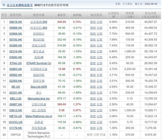 易方达亚洲精选,除前十大重仓股外,持股比例超过2%的股票还包括药明生物、美股Sea Ltd、李宁、百胜中国、同仁堂国药、美股Meta(脸书)、美股Alphabet Inc(谷歌)等。