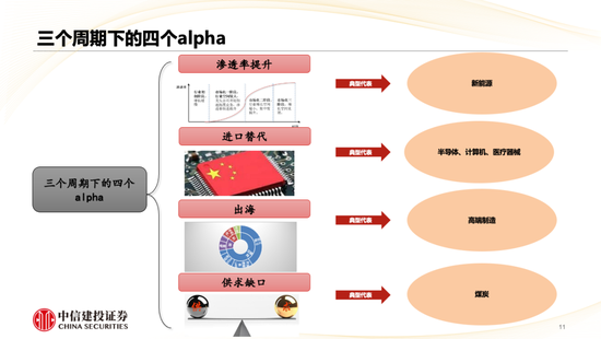 对于投资线索来说,在这三个周期之下,我们要寻找四个α:渗透率、进口替代、国际化和供求缺口。