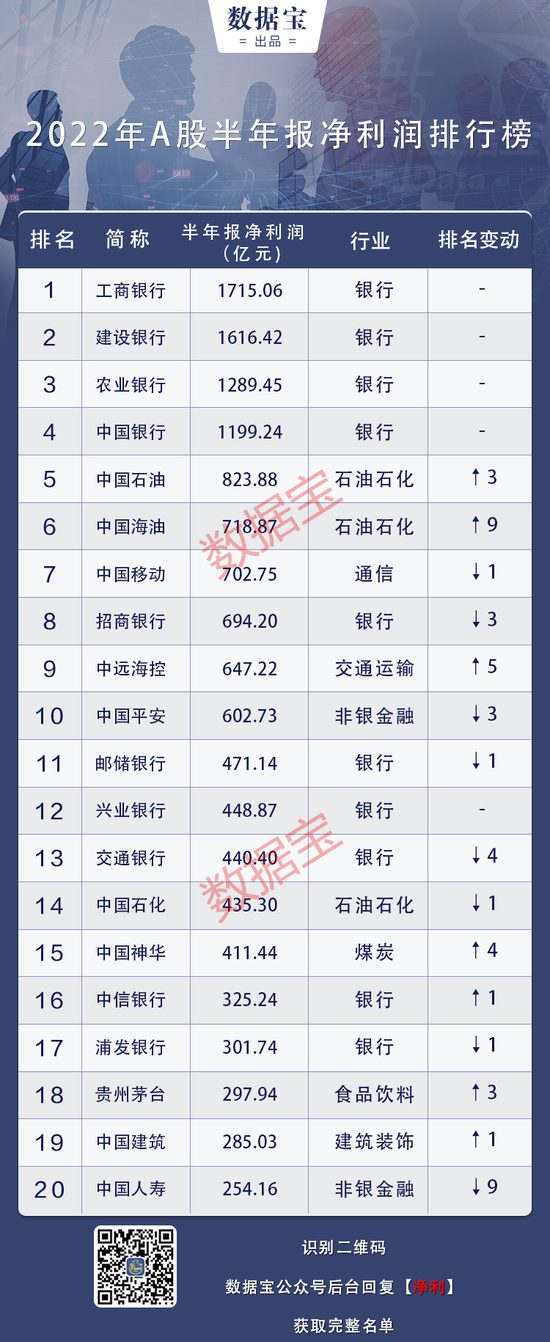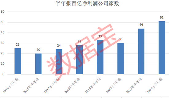 上半年,百亿净利润公司有51家,相比去年增加7家,数量创历史之最。千亿净利公司数量保持稳定,仍是工农中建四家国有大行。数据宝统计,4家国有大行已连续7年保持半年报净利超千亿的水平,且是A股仅有的4家。