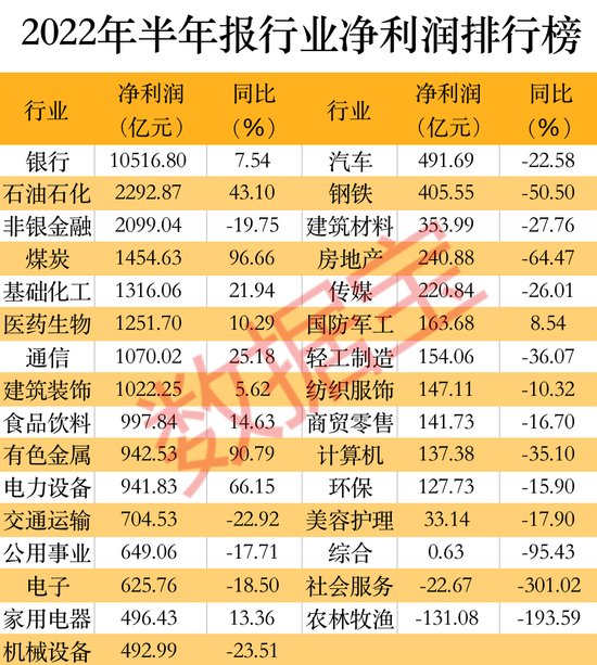 上半年,净利润超过千亿的行业有8个,相比去年增长3个,数量创新高,新增行业包括煤炭、建筑装饰和通信。银行是唯一万亿净利行业,也创造行业半年报净利超万亿的历史。石油石化、非银金融两个行业净利均超2000亿元。从增幅来看,煤炭、有色净利润增幅超过90%,其中煤炭增幅达到96.66%,几乎达到全行业利润翻倍。
