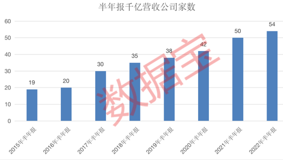 上半年,营收突破千亿公司达到54家,数量创历史新高。万亿营收公司达到3家,中国建筑首次半年报营收破万亿。值得关注是,单家公司营收也破A股纪录,首次出现半年营收超1.6万亿公司,中国石化、中国石油历史最高半年营收分别为1.49万亿和1.19万亿,今年两家公司营收均突破1.6万亿。