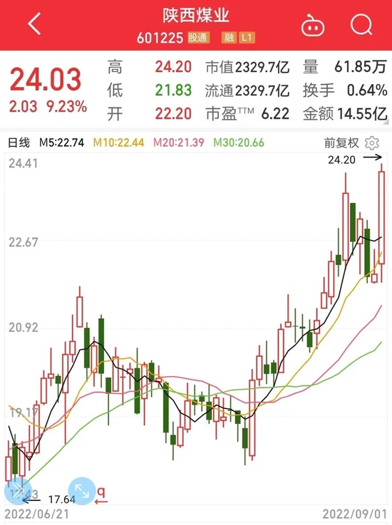 煤炭龙头陕西煤业早盘一度涨停,股价创历史新高,A股市值突破2300亿元,午间收涨9.23%。地产板块渝开发、粤宏远A、空港股份(维权)、沙河股份、京投发展等低价股涨停。其中京投发展两连板,最新股价5.3元/股。