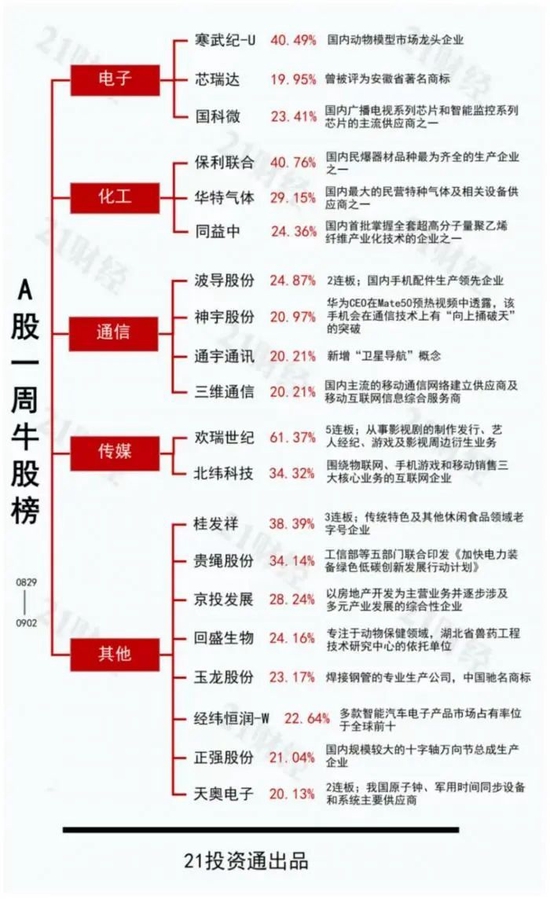 本期牛股榜中,欢瑞世纪(000892.SZ)以61.37%的周涨幅夺魁,保利联合(002037.SZ)、寒武纪-U(688256.SH)、桂发祥(002820.SZ)等周涨幅紧随其后,牛股榜前19的个股涨幅均超20%。