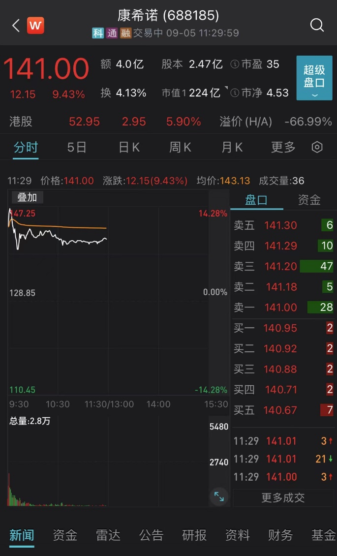 康希诺、复星医药两只医药龙头股的走势,今日上午显著分化。