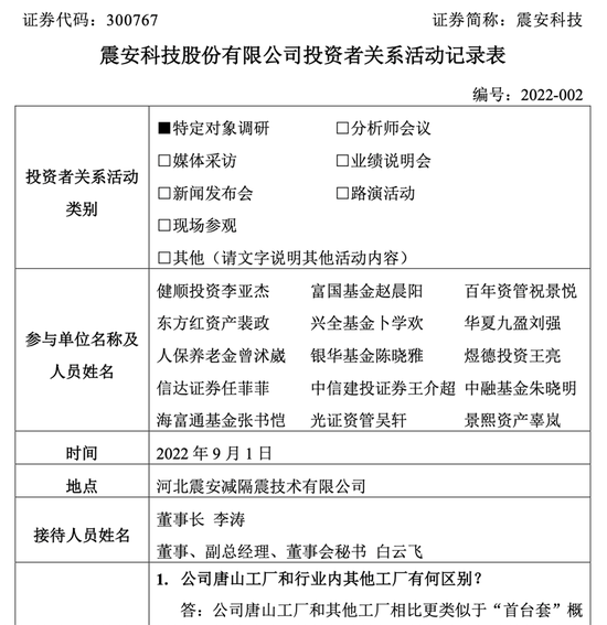 有意思的是,就在9月1日,震安科技接待了包括海富通、富国、东方红资产等多家机构的调研。而震安科技前不久刚刚公布的半年报业绩并不理想,公司2022上半年实现营业总收入4.31亿元,同比增长29.9%;实现归母净利润5464万元,同比下降16.5%,降幅较去年同期收窄;每股收益为0.23元。