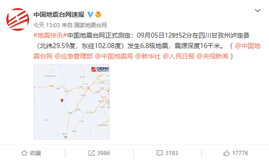 最终,根据中国地震台网的测定,今天的地震发生在四川甘孜州泸定县(北纬29.59度,东经102.08度),震级达到6.8级,震源深度16千米。