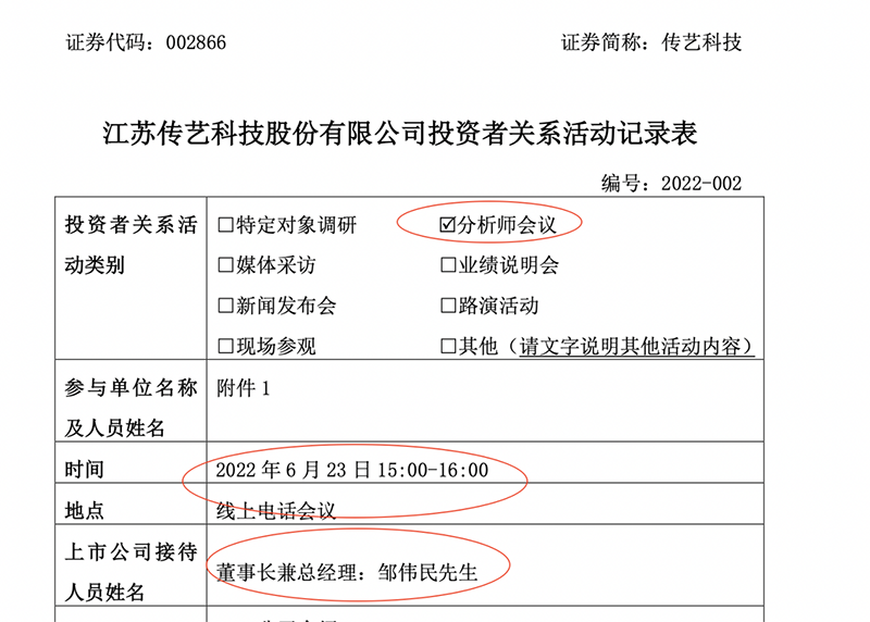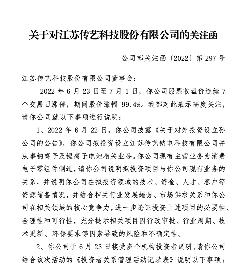 深交所在通报批评处分决定中表示,今年6月23日,传艺科技通过电话会议方式接受多个机构投资者及个人投资者调研,并于次日在互动易平台刊载《投资者关系活动记录表》。在前述投资者关系管理活动和《投资者关系活动记录表》中,传艺科技对外发布了钠离子电池业务未来规划、技术水平等涉及公司经营的重大信息,但直至7月9日才正式通过《关于对深圳证券交易所关注函回复的公告》补充披露相关事项。公司存在以非正式公告方式发布未公开重大信息的行为。