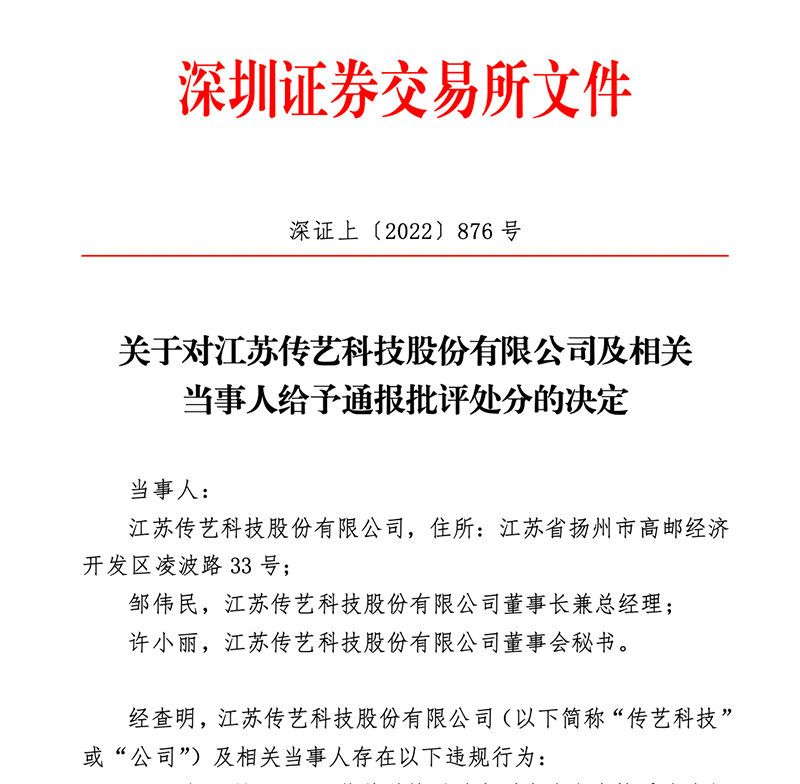 一、依据深交所相关规定,经纪律处分委员会审议通过,深交所对传艺科技给予通报批评的处分;