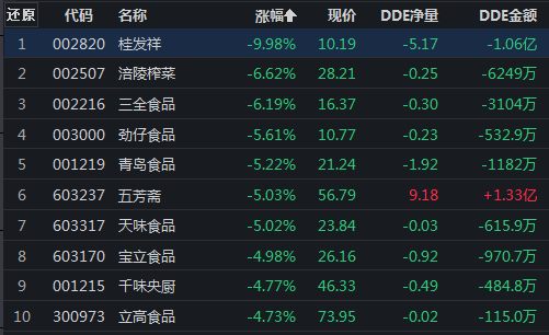 食品加工制造板块全线走低,板块下跌2.1%,桂发祥跌停,五芳斋、劲仔食品、千味央厨等跟跌。