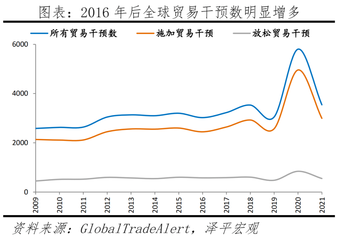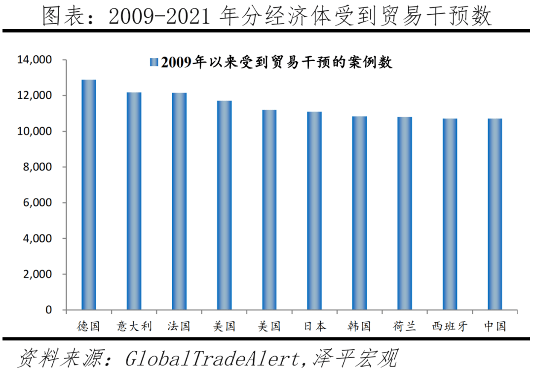 收入分配问题增加了发达经济体的阶层矛盾和社会风险,内部矛盾向外转移,贸易保护主义和孤立主义抬头。据不完全统计,从2016年后,全球的贸易干预措施案例数开始明显增多,其中以出口补贴,和对外施加关税为主。美国是对外施加制裁最多的国家,而各个发达经济体(以德国为首)实际上是受到贸易保护措施干预最多的国家。美欧等经济体要求产业链回流、强调国内根本性安全(能源、粮食、军事),必然推升生产成本和商品价格的上涨。