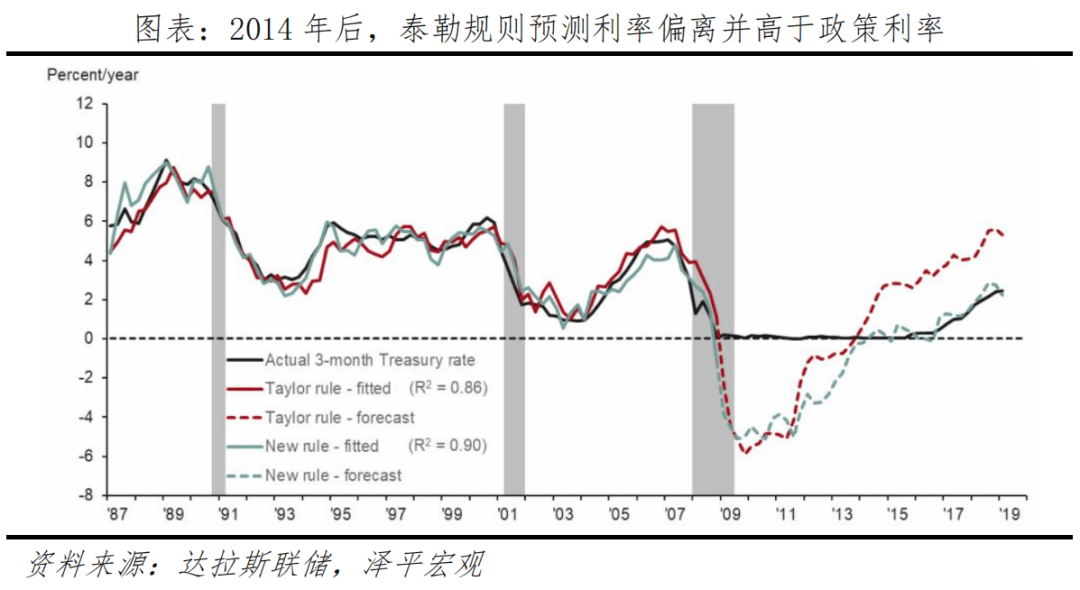 1993年问世以来,泰勒规则是美联储制定政策以及市场“观测”美联储政策利率的主要工具,其经历了吻合-零利率下限-偏离的过程,也反映了美联储的低利率依赖。1)沃尔克和格林斯潘时期,通胀预期稳定、菲利普斯曲线陡峭,泰勒规则预测利率和政策利率较为一致。2)2008年金融危机冲击美国经济,因此在伯南克时期,美联储更加重视经济增长和就业,调高了泰勒公式中产出缺口的系数,并在之后几年维持零利率鸽派立场。3)耶伦时期,更加重视劳动力市场,美联储在失业率恢复后,迟迟未看到劳动参与率好转,延缓了加息进程,导致泰勒规则预测利率偏离并高于政策利率。达拉斯联储的研究显示,2008年之后标准泰勒规则的覆灭,除开“零利率下限(ZLB)”的限制外,在正区间内传统规则也大幅高于实际的政策利率。